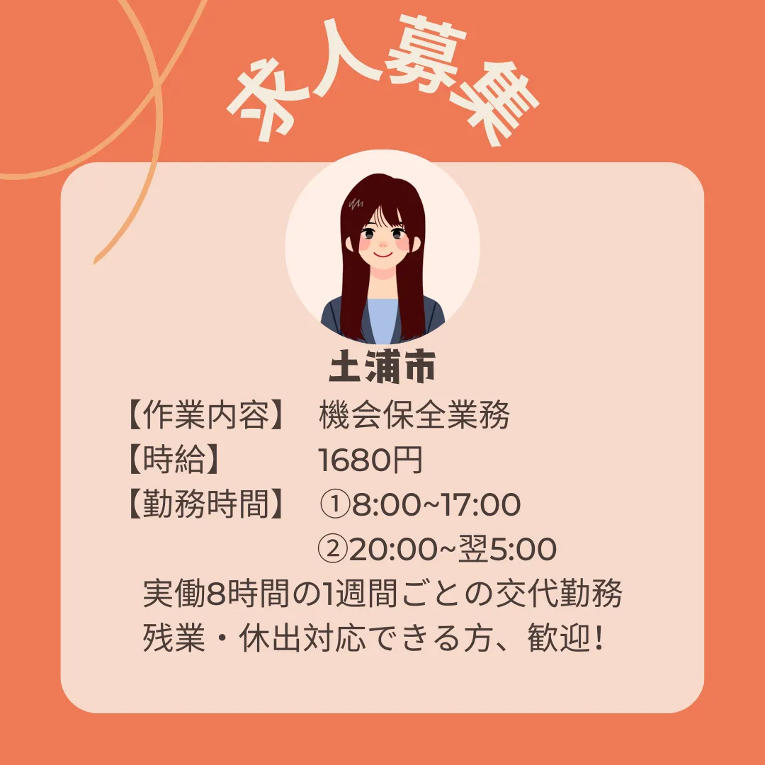 | 福利厚生 | ・昇給制度あり・交通費支給・各種社会保険完備・有給休暇・定期健康診断(年1回) ・キャリアアップ制度 ・ストレスチェック ・インフルエンザワクチン接種一部補助・メンタルヘルス相談窓口・年末調整手続き代行・駐車場完備 ・指定喫煙所あり・トイレ男女別・車通勤OK・WEB面接・制服貸与 |